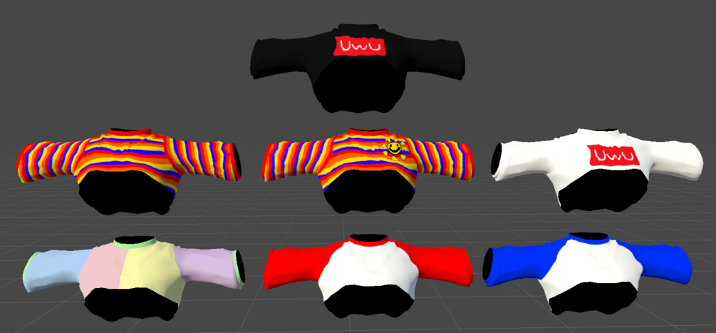 1 shirt,16 textures,1 substance painter file, 7 Shapekeys to help fit different body shapes, 4,684 tris. Substance painter recommended for editing textures, this can be slapped on in unity but if u want absolutely no clipping issues it is recommended to make a shapekey on the hyenid to shrink the body under the shirt.
